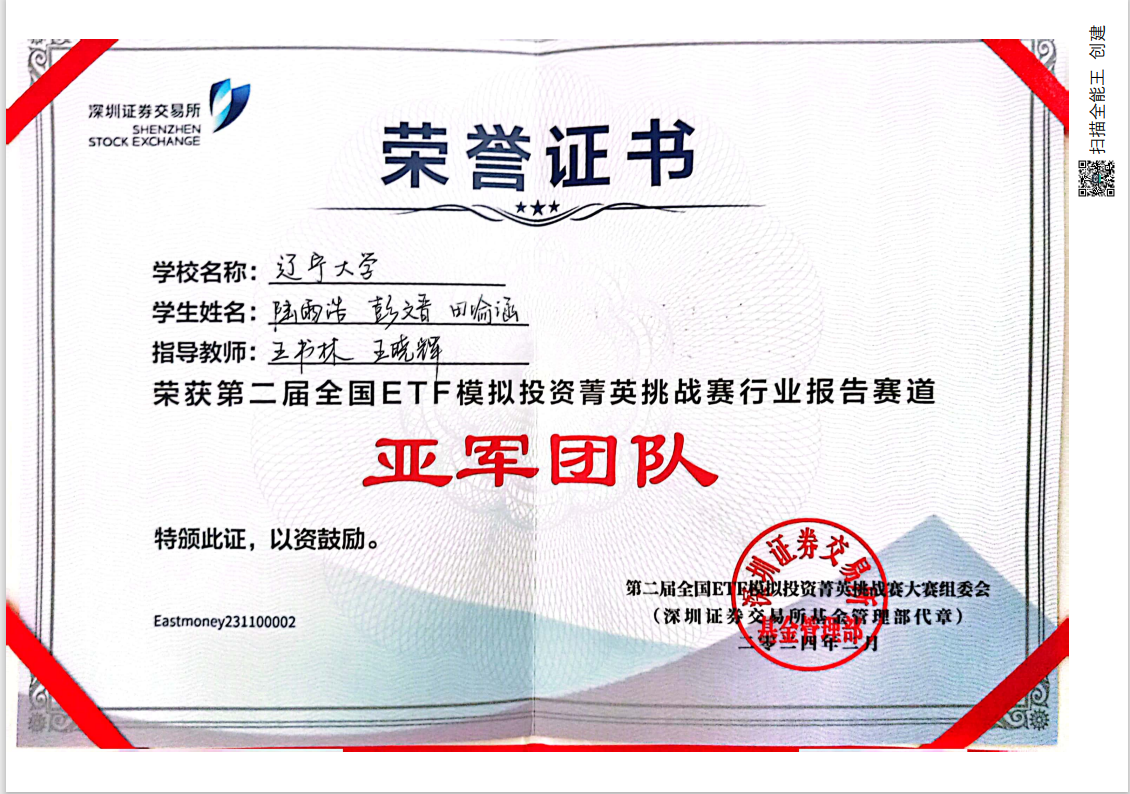 近日,备受瞩目的“第二届全国ETF模拟投资菁英挑战赛”圆满落幕。在这场激烈的比赛中,公司由王书林、王晓辉两位老师指导、2022级本科生陆雨浩、彭文晋、田喻涵组成的团队表现出色,他们凭借深入的行业研究、精准的投资判断和出色的团队协作能力,成功从来自185所高校的1263支队伍中脱颖而出,荣获全国亚军,为学院争得了荣誉。